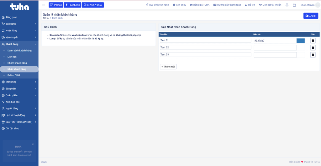 - Xóa nhãn → hệ thống gỡ nhãn đó khỏi tất cả đơn hàng và khách liên quan.