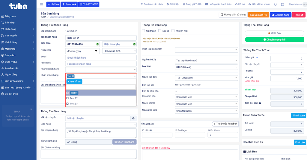 Trong Chi tiết đơn hàng, hệ thống hiển thị thêm trường: